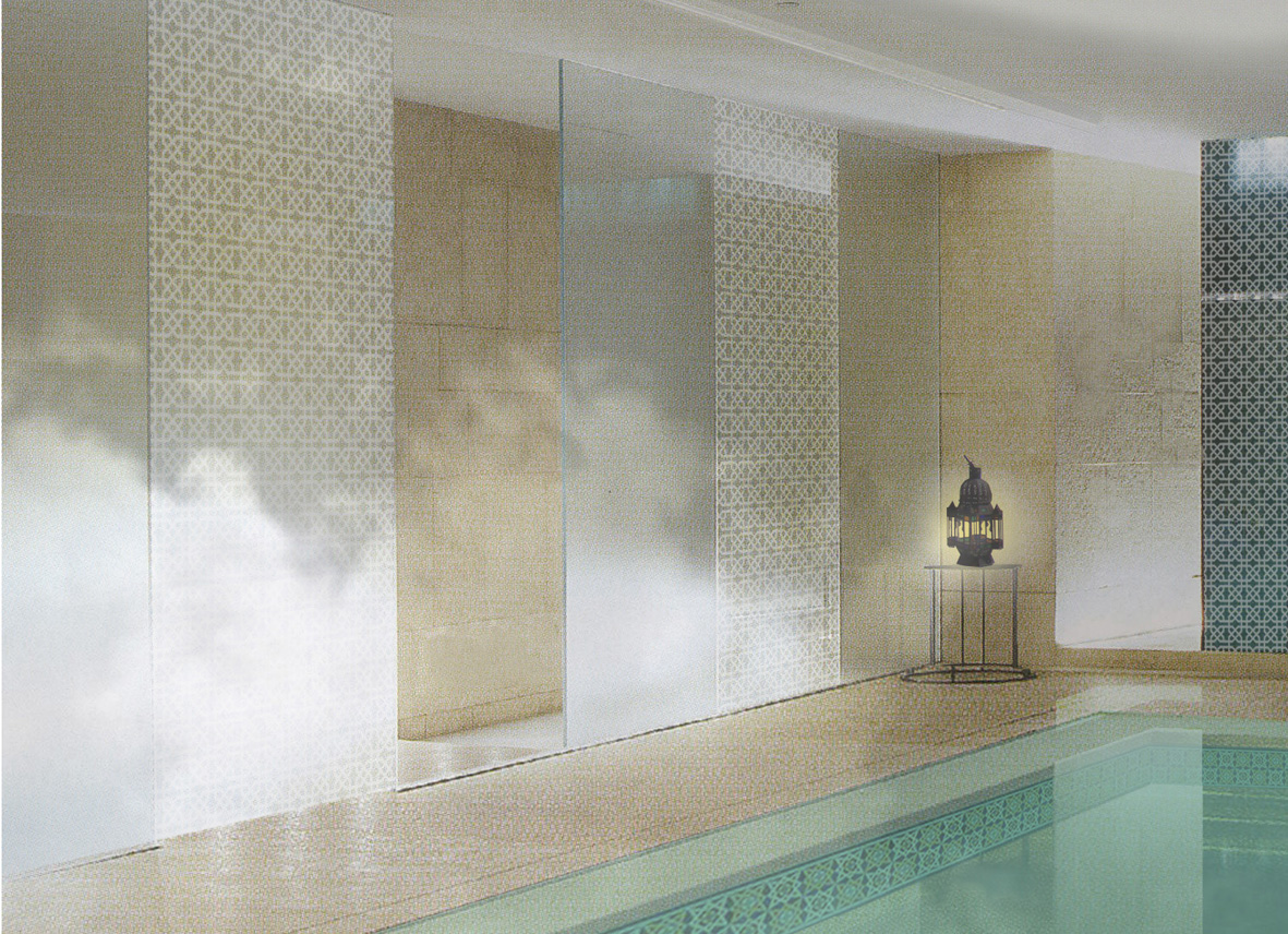 Inspiration arabo-andalouse pour la création de ce spa de luxe : matériaux traditionnels revisités dans les hammams et la piscine, graphisme stylisé des moucharabiehs ancestraux, codes ethniques revus de sobriété pour une esthétique intemporelle. Dans le prolongement du spa, le bar à fruits offre un moment de fraicheur.