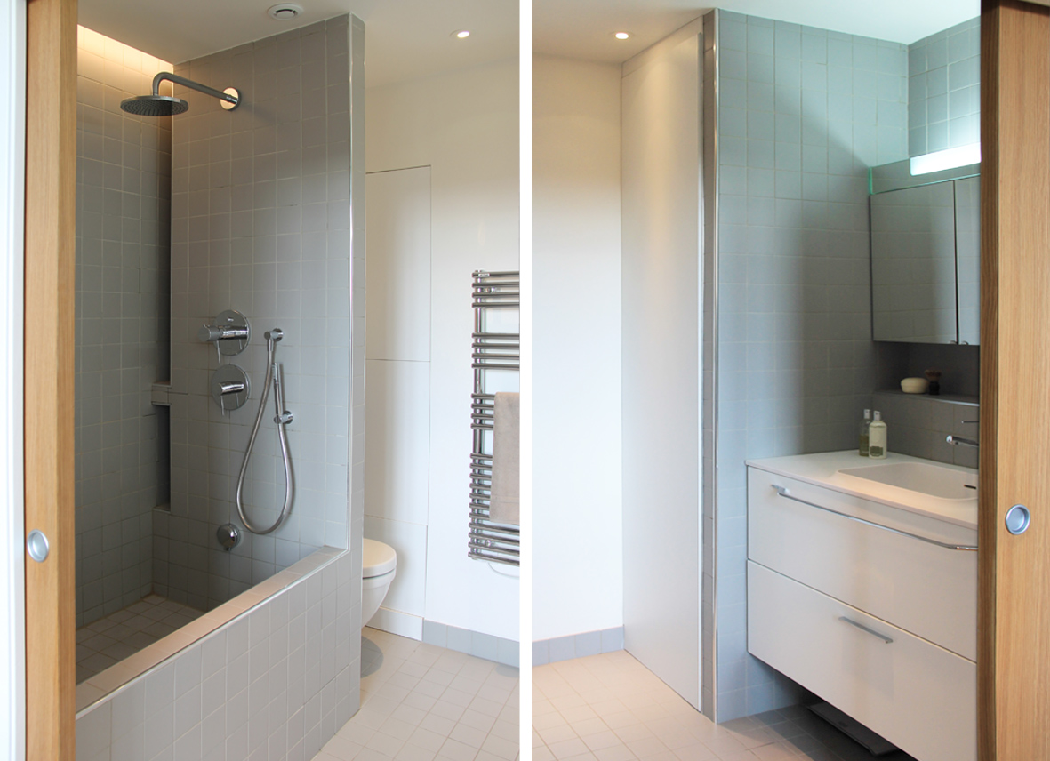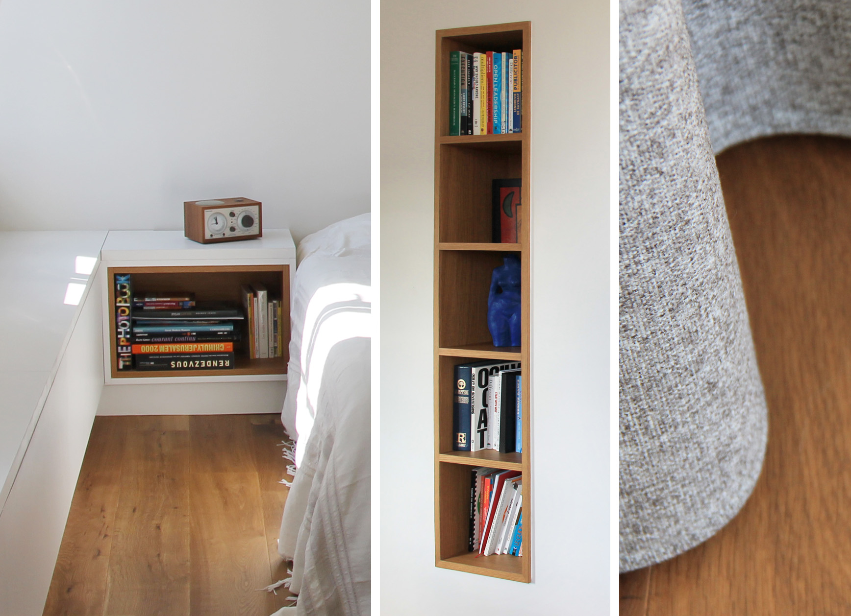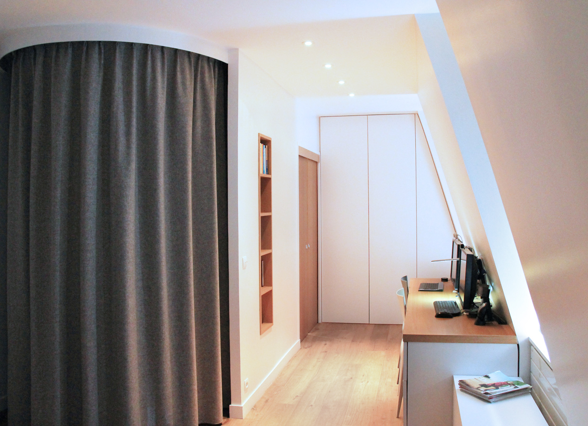 Isoler, ranger, optimiser et styliser, tel était le cahier des charges de la rénovation de cette suite parentale sous comble. En réponse, l’agence a proposé une salle de bains géométrique et épurée, des meubles intégrés et emboités, dans un confort douillet apporté par la chaleur du bois et la douceur d’un lourd rideau qui ferme la trémie d’escalier.