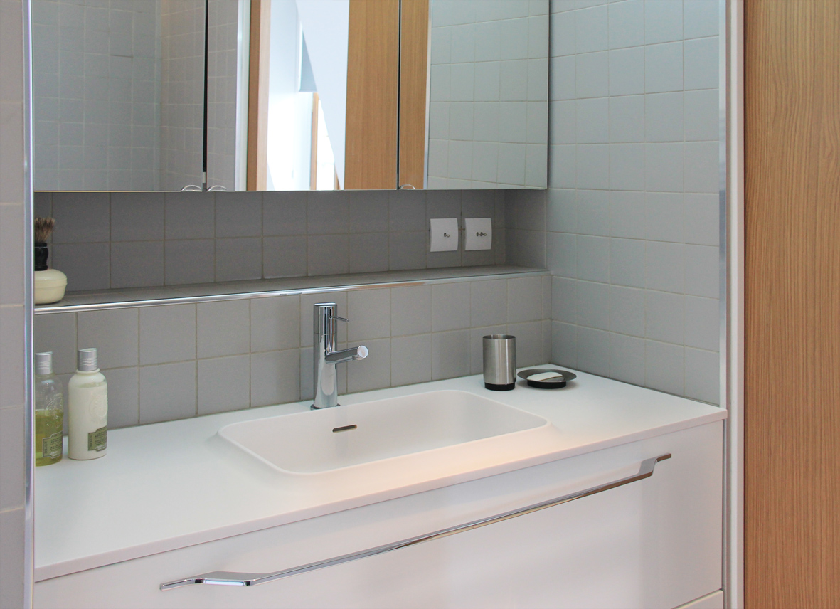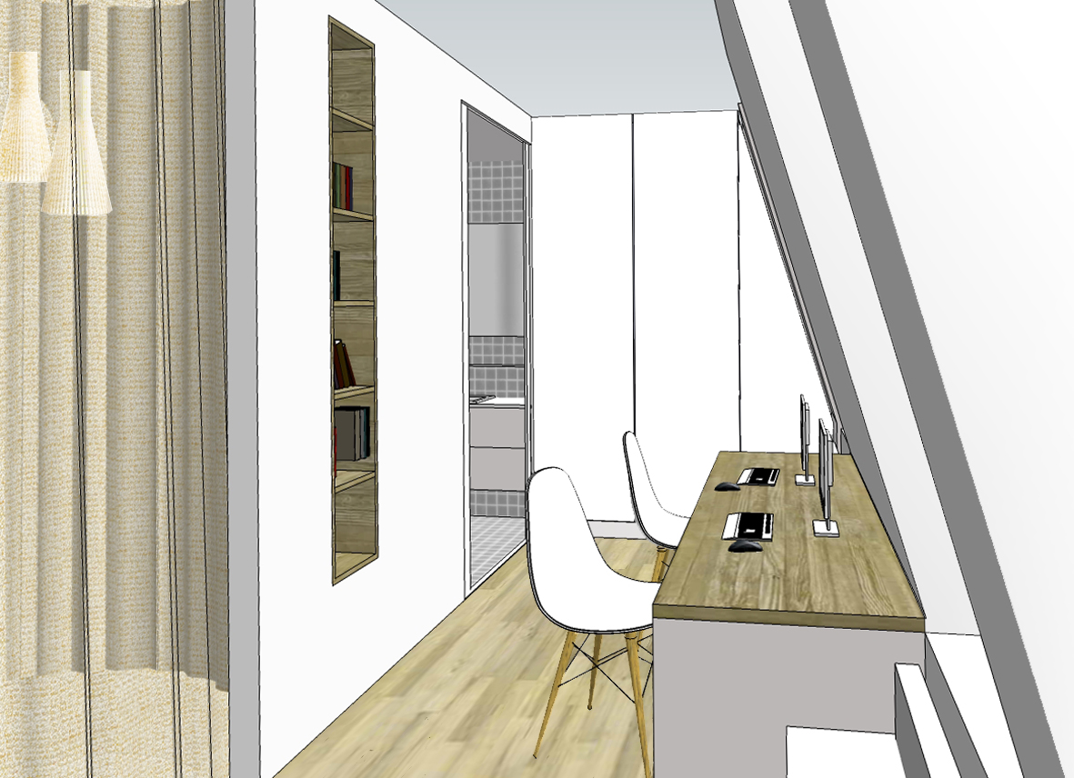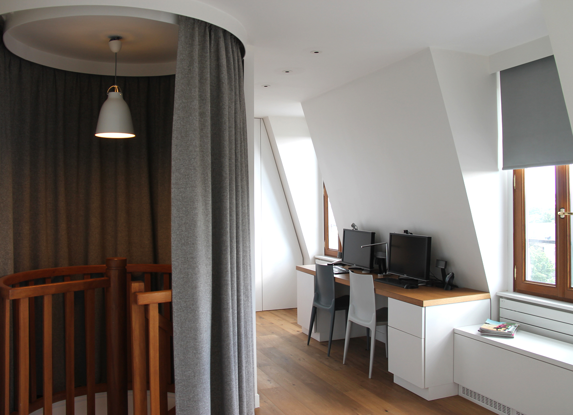 Isoler, ranger, optimiser et styliser, tel était le cahier des charges de la rénovation de cette suite parentale sous comble. En réponse, l’agence a proposé une salle de bains géométrique et épurée, des meubles intégrés et emboités, dans un confort douillet apporté par la chaleur du bois et la douceur d’un lourd rideau qui ferme la trémie d’escalier.