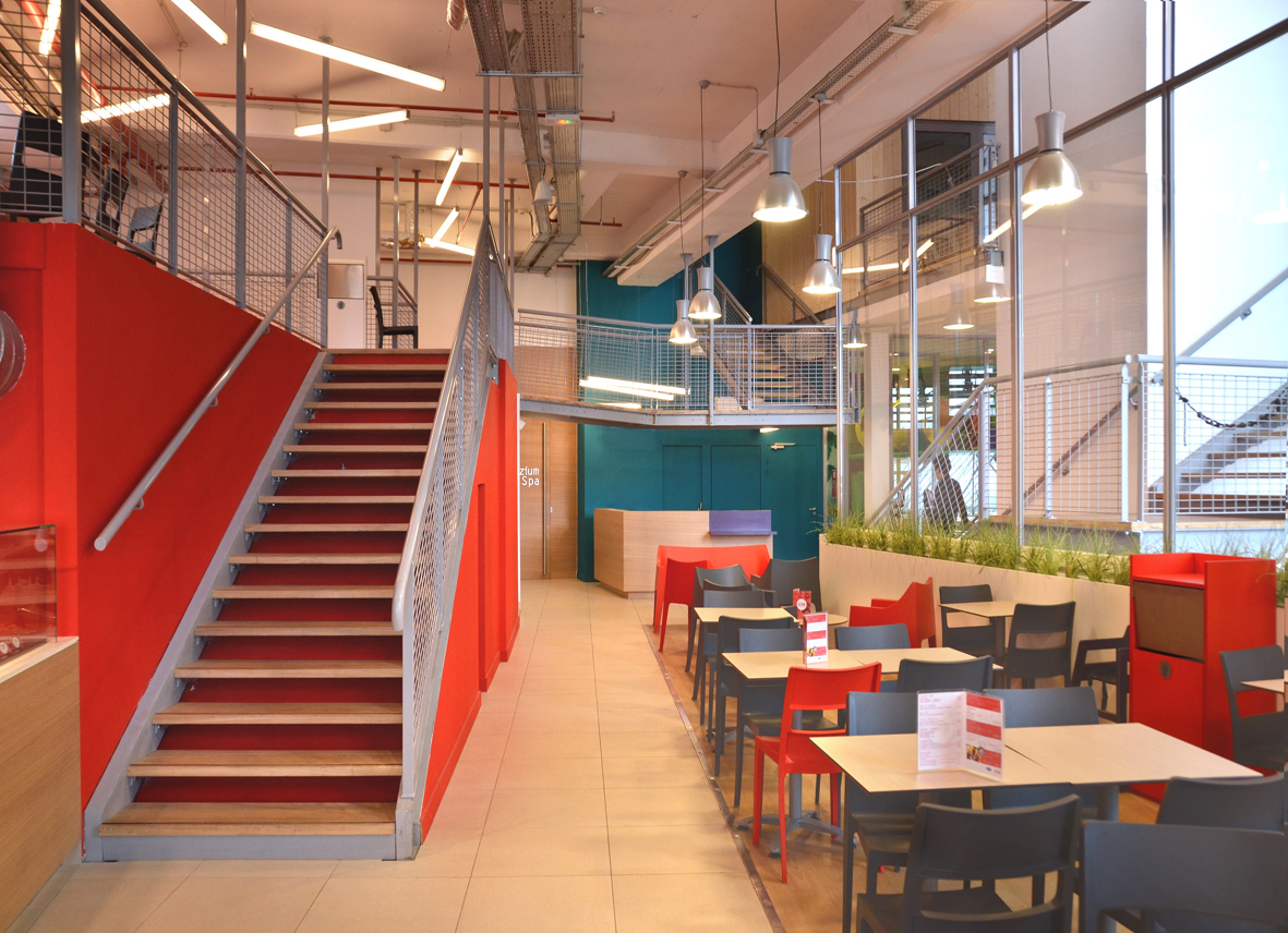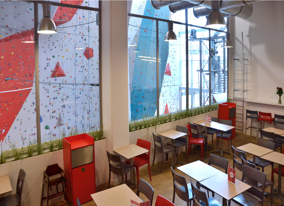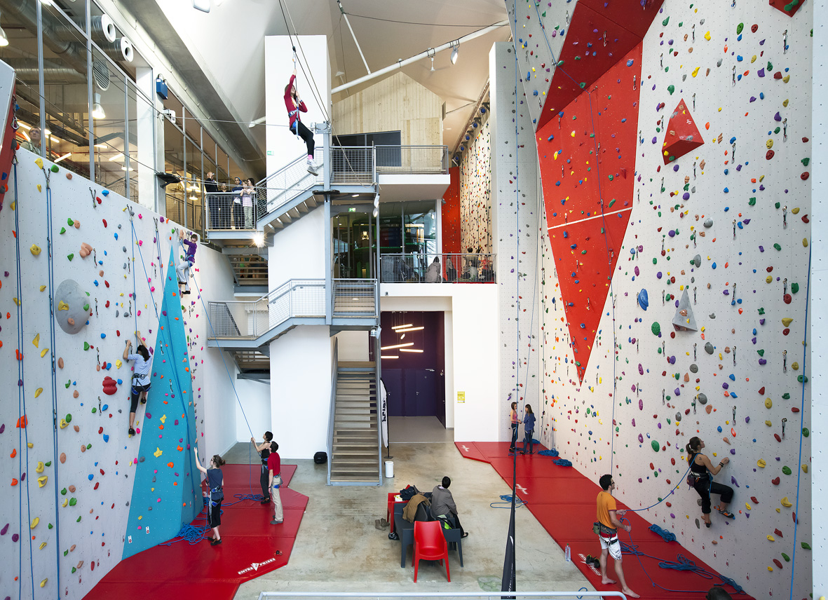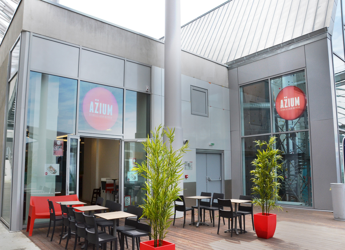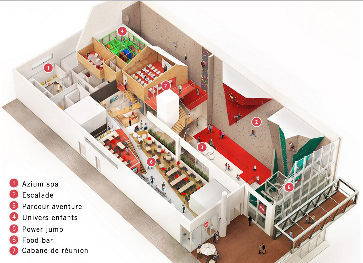 Situé au cœur du nouveau quartier de Lyon Confluence, AZIUM est un vaste espace de loisirs et de détente indoor. Un restaurant, un spa, une aire de jeux modulaires pour enfants et une ‘cabane’ de réception nichée dans les hauteurs du bâtiment s’articulent autour d’un atrium d’escalade de 23 m de hauteur, déployant 250 voies d’escalade, un parcours aventure et une tour de sauts. Le concept architectural, ludique et contemporain, permet d’appréhender toutes les fonctions de ce volume complexe depuis l’extérieur.